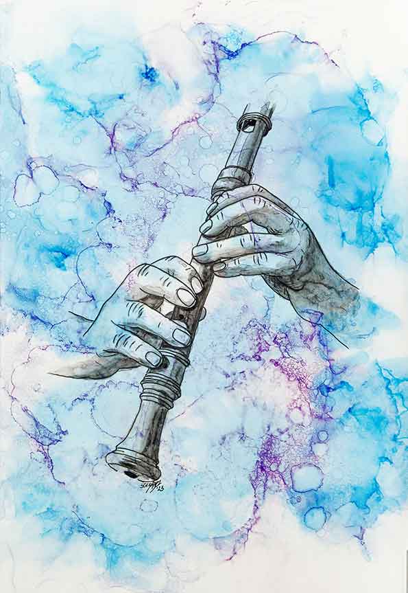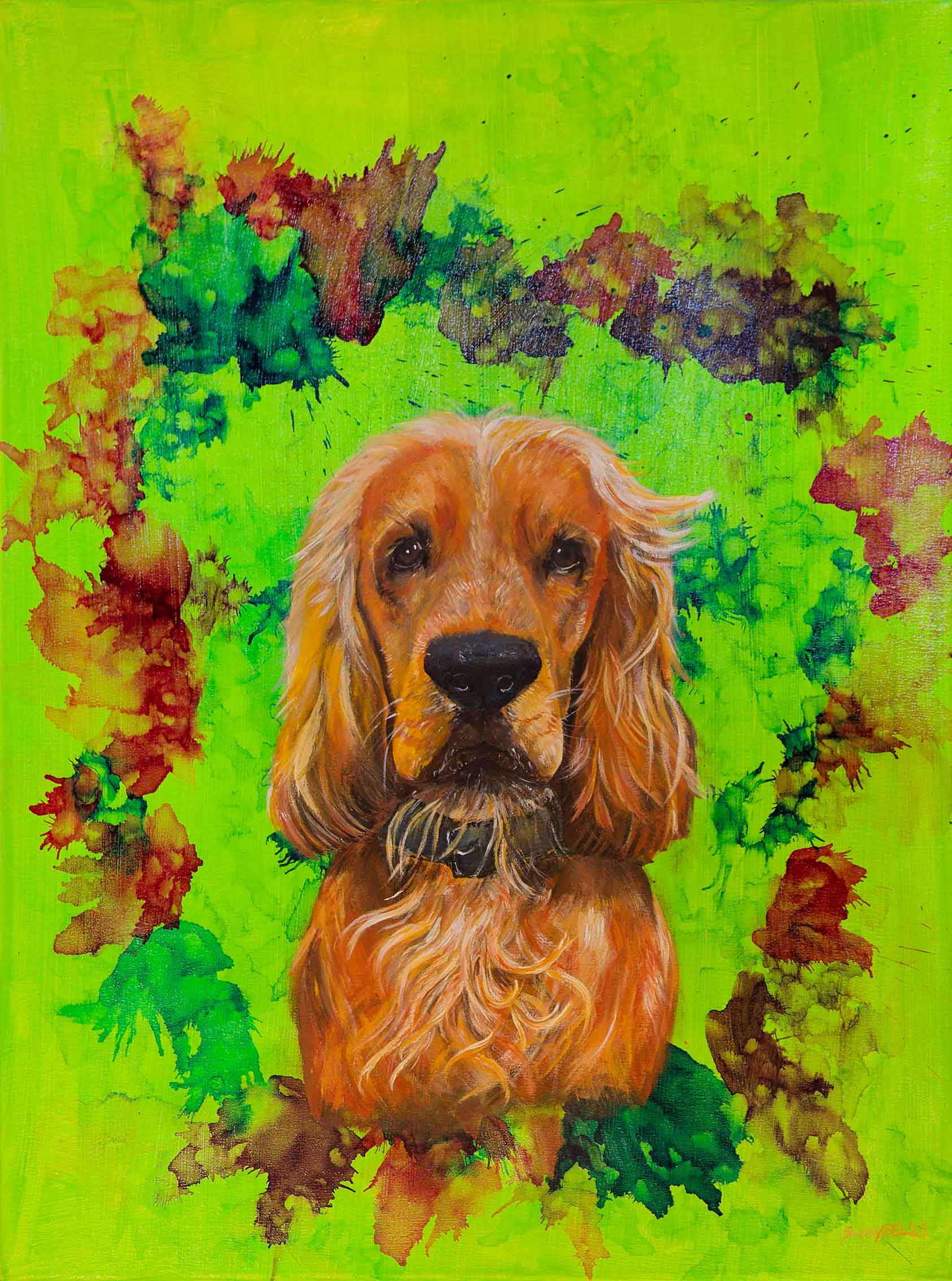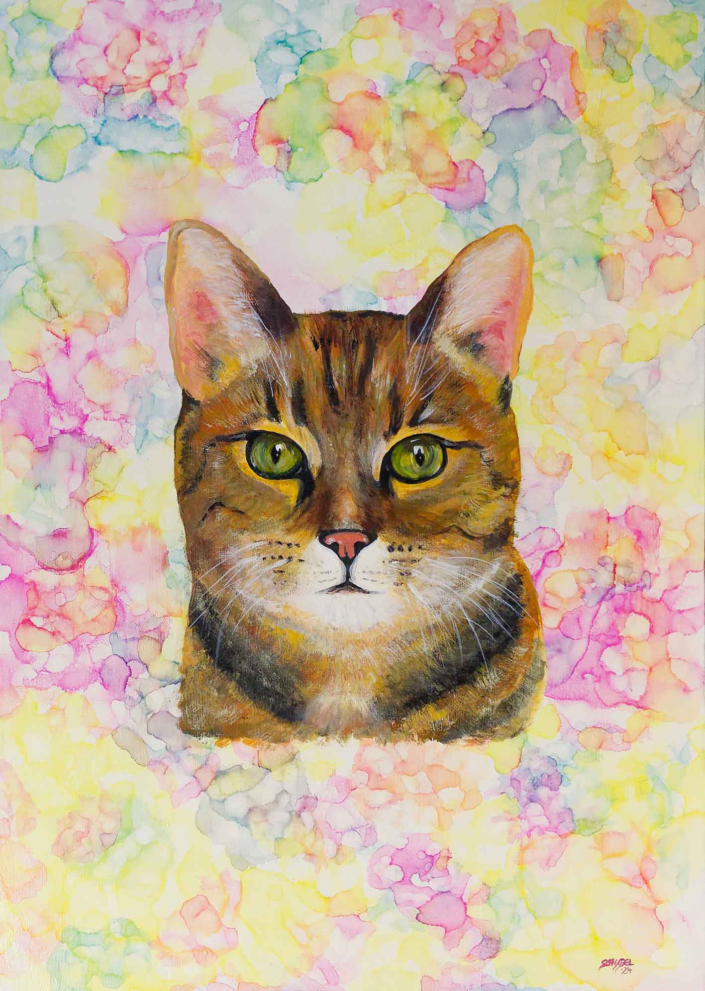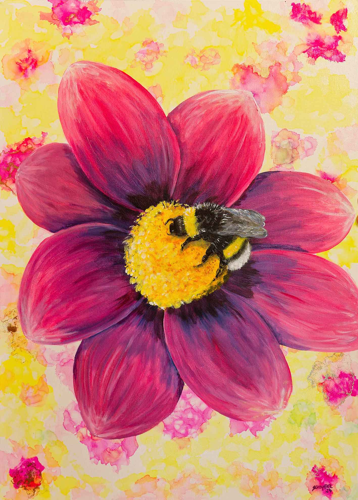 Alcohol-Ink, Tinte auf Alkohol- statt auf Wasserbasis, ist ein extrem leuchtkräftiges Medium, das allerdings in der Verarbeitung schwer zu kontrollieren ist, sich höchst aleatorisch verhält. Susanne Schnabels Ehrgeiz liegt darin, keine zufälligen abstrakten Farbspiele zuzlassen, sondern auch dieses Werkzeug in die realistische Malerei einzubinden.